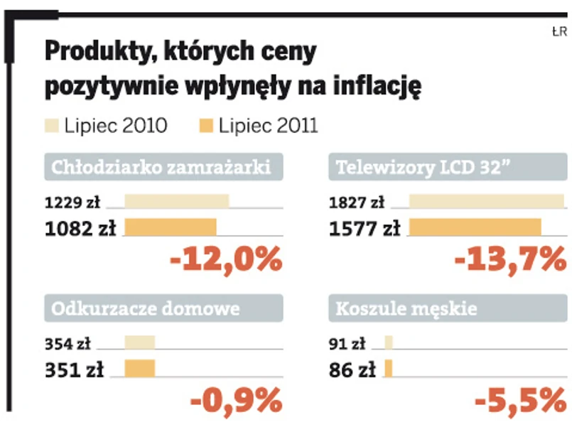 Ponadto o 4 proc. potaniał również sprzęt teleinformatyczny – skurczyły się między innymi ceny telefonów, komputerów i drukarek. Coraz mniej kosztuje także odzież. W lipcu jej średnie ceny były o 0,5 proc. niższe niż przed rokiem. Niektóre części garderoby potaniały jeszcze bardziej, np. męskie koszule aż o 5,5 proc.