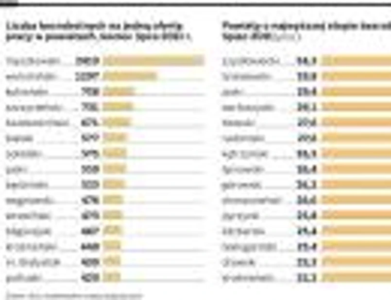 W niektórych powiatach oferty znikają tak szybko, że już w końcu lipca nie było ani jednej. Tak było np. w powiecie kluczborskim (woj. opolskie), w którym zarejestrowanych było ponad 3,1 tys. bezrobotnych, łomżyńskim (woj. podlaskie) – ponad 2,1 tys., oleskim (woj. opolskie) – ponad 2,1 tys. i węgorzewskim (woj. warmińsko-mazurskie) – ponad 1,7 tys. Tak wynika z danych, które „DGP” zebrał w wojewódzkich urzędach statystycznych.