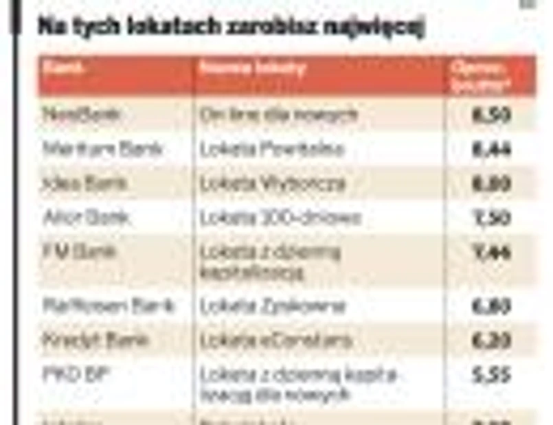 Na trzymiesięcznej Lokacie Powitalnej z dzienną kapitalizacją w Meritum Banku można uzyskać odsetki odpowiadające 8,44 proc. na standardowym depozycie. Idea Bank oferuje na Lokacie Wyborczej odsetki odpowiadające 8 proc. na depozycie objętym podatkiem, a neoBank – aż 8,5 proc. brutto na lokacie On-line dla nowych.