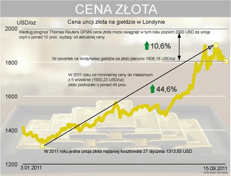 „Problemy strefy euro wciąż trwają, kwestia długów narodowych może się przenieść na Stany Zjednoczone, a niepokój o gospodarkę światową nie ustaje,” mówi Neil Meader, kierownik badań w GFMS. „Gdzie indziej lokować kapitał?” Złoto radzi sobie w tej chwili na rynku lepiej niż jakiekolwiek akcje, towary czy obligacje.