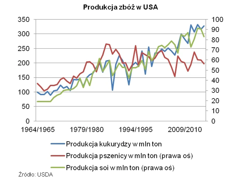 Bezpośrednią przyczyną dynamicznych spadków cen w ciągu ostatnich dwóch tygodni była najnowsza prognoza Amerykańskiego Departamentu Rolnictwa (USDA). Raport ten przyniósł rewizje bilansów i zapasów na wszystkich trzech najważniejszych rynkach zbóż. Dzięki wyższym niż przed miesiącem szacunkom zbiorów pszenicy i soi, prognozowany, zagregowany deficyt w bieżącym sezonie spadł do 8,9 mln ton z 16,12 mln ton przed miesiącem. Nieznacznie wzrósł zaś szacowany, łączny poziom zapasów (z 33,5 tyg. konsumpcji do 34,4 tyg.). Poprawa sytuacji fundamentalnej wynika głównie ze wzrostu prognoz poziomu podaży zbóż w Kanadzie, krajach Ameryki Południowej i Unii Europejskiej oraz rewizji w dół szacunków konsumpcji kukurydzy w USA.