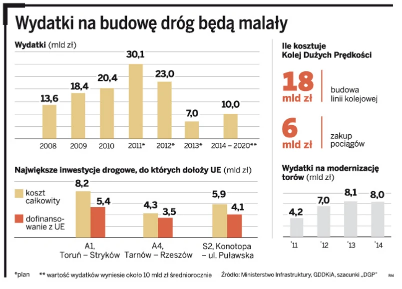 Kwestią otwartą pozostaje także plan i sposób finansowania budowy dróg krajowych na lata 2015 – 2020. Rząd szykuje się do radykalnego ograniczenia wydatków na nowe drogi. W latach 2014 – 2020 obecna ekipa zaplanowała na ten cel nie więcej niż 60 mld zł. Pierwszym objawem finansowych kłopotów była nowela przyjętego w 2007 r. rządowego programu budowy autostrad i dróg krajowych zakładającego budowę do 2012 r. 1 tys. km nowych autostrad i 2 tys. dróg ekspresowych kosztem 120 mld zł. W styczniu tego roku rząd przyjął nowy program budowy dróg krajowych do 2015 r., który przewiduje, że na koniec 2013 r. sieć autostrad w Polsce będzie miała ok. 1500 km i mniej więcej tyle samo będzie dróg ekspresowych. Wiele wskazuje więc na to, że tempo rozwoju infrastruktury liniowej będzie zależało od hojności unijnych urzędników i zdolności negocjacyjnych polskiej strony. Na razie ustępujący rząd liczy, że Polsce przypadnie nawet 300 mld zł unijnych środków. Jak zostaną podzielone, dopiero się okaże.