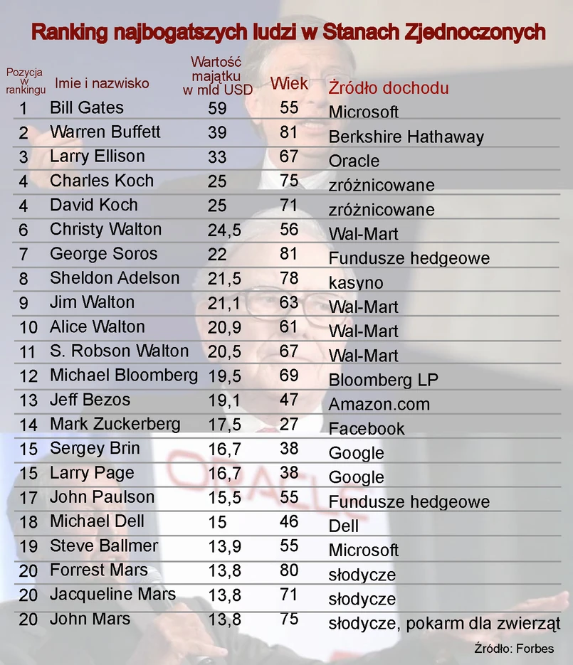 Bill Gates - najbogatszy Amerykanin fortuny wartej obecnie 59 mld dolarów dorobił się jako szef Microsoftu. Obecnie prowadzi działalność charytatywną finansując walkę z chorobami, m.in. z polio i malarią. Na drugim miejscu znalazł się rekin inwestycji Warren Buffet (39 mld $), pomysłodawca nowego podatku dla najbogatszych Amerykanów. Co prawda ostatni rok nie był dla niego zbyt korzystny (jego majątek skurczył się o 6 miliardów dolarów), nadal jednak nie znalazł się nikt, kto odebrałby mu drugą pozycję na liście. Tuż za nim (o 6 mld dolarów) znalazł się Larry Ellison, znacznie mniej znany od wyżej wymienionych prezes Oracle Corporation.