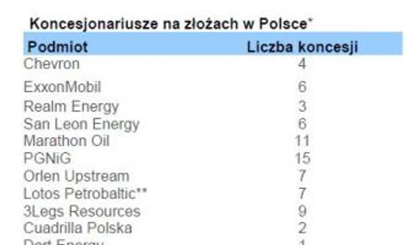 PGNiG jest posiadaczem największej liczby koncesji na poszukiwania i wydobycie gazu łupkowego. Spółka ma ich aż 15. Orlen Upstream, który działa z ramienia PKN Orlen, ma ich o połowę mniej (7). Oprócz polskich firm łupków poszukują międzynarodowe firmy, takie jak Exxon Mobil, największa energetyczna spółka giełdowa na świecie, która zajmuje się m.in. wydobyciem łupków w Stanach Zjednoczonych.