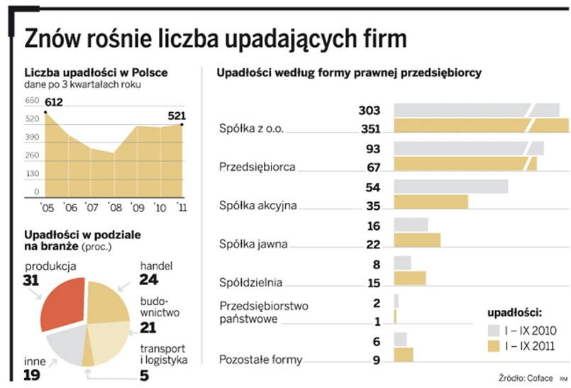 Najwięcej firm upada w branżach budowlanej i spożywczej. W pierwszym i drugim kwartale ich liczba spadała w porównaniu z rokiem 2010 r., ale w trzecim trend się odwrócił i zbankrutowały 174 firmy. Tak wynika z najnowszego raportu przeprowadzonego przez firmę Coface. Ale upadłości na polskim rynku jest znacznie więcej. Raport nie obejmuje firm, które likwidują biznes bez przeprowadzania postępowania sądowego, bo je na to już nie stać. oraz przedsiębiorstw, które zawieszają działalność.