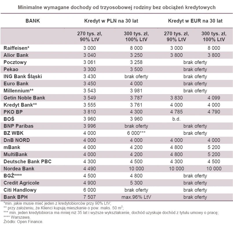 Na trzecią pozycję wszedł BZ WBK, który zdobył 8,5 na 10 możliwych punktów. Zaletą kredytu BZ WBK z pewnością jest marża od 0,99 p.p., niewysoka 2-proc. prowizja, którą bank kredytuje i brak rozbudowanego cross-sellu. Bank oczekuje założenia konta z wpływami min. 2 tys. zł. Nie jest jednak szczególnie hojny, bo przykładowej rodzinie pożyczyłby ok. 480 tys. zł, czyli ponad 100 tys. zł mniej niż gotów pożyczyć najwięcej Getin Noble Bank. Trzyosobowej rodzinie udzieli kredytu w wysokości 270 tys. zł przy dochodach netto wynoszących co najmniej 4 tys. zł.
