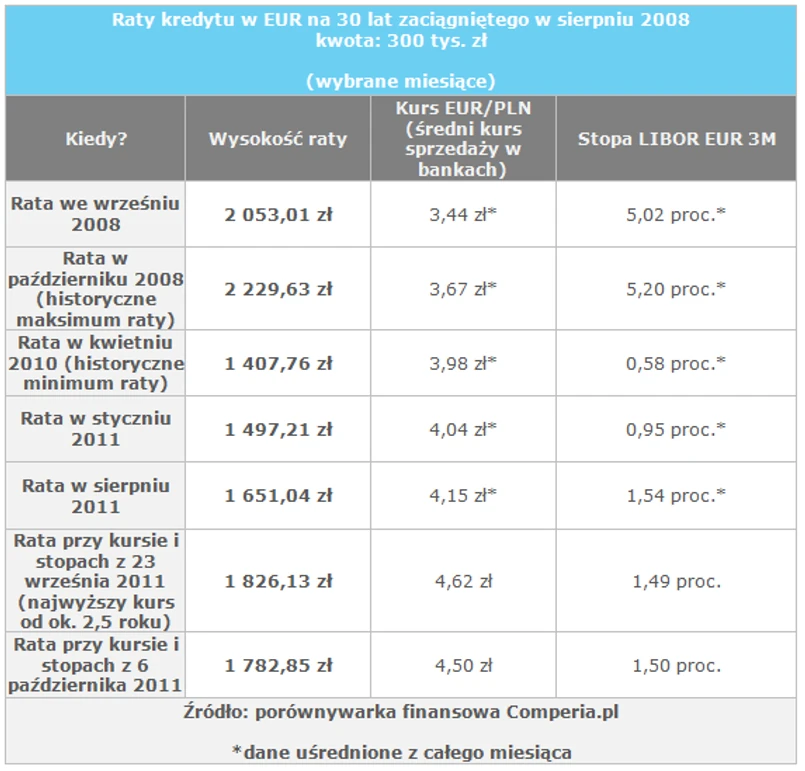 Także przeanalizowanie wysokości raty kredytu w PLN zaciągniętego w tym samym okresie potwierdza słuszność wyboru opcji zadłużenia się w euro. Co prawda było kilka okresów (w tym też końcówka września br.), kiedy rata kredytu w złotych była niższa od zobowiązania w euro, ale: (1) łącznie dotychczas zadłużony w euro zapłacił ok. 3,3 tys. zł mniej niż gdyby zaciągnął kredyt w złotych, (2) wzięty pod uwagę moment zaciągnięcia kredytu w euro był zdecydowanie najgorszy, więc wszystkie inne kredyty wykazują jeszcze wyższe „oszczędności” na wyborze euro jako waluty kredytu.