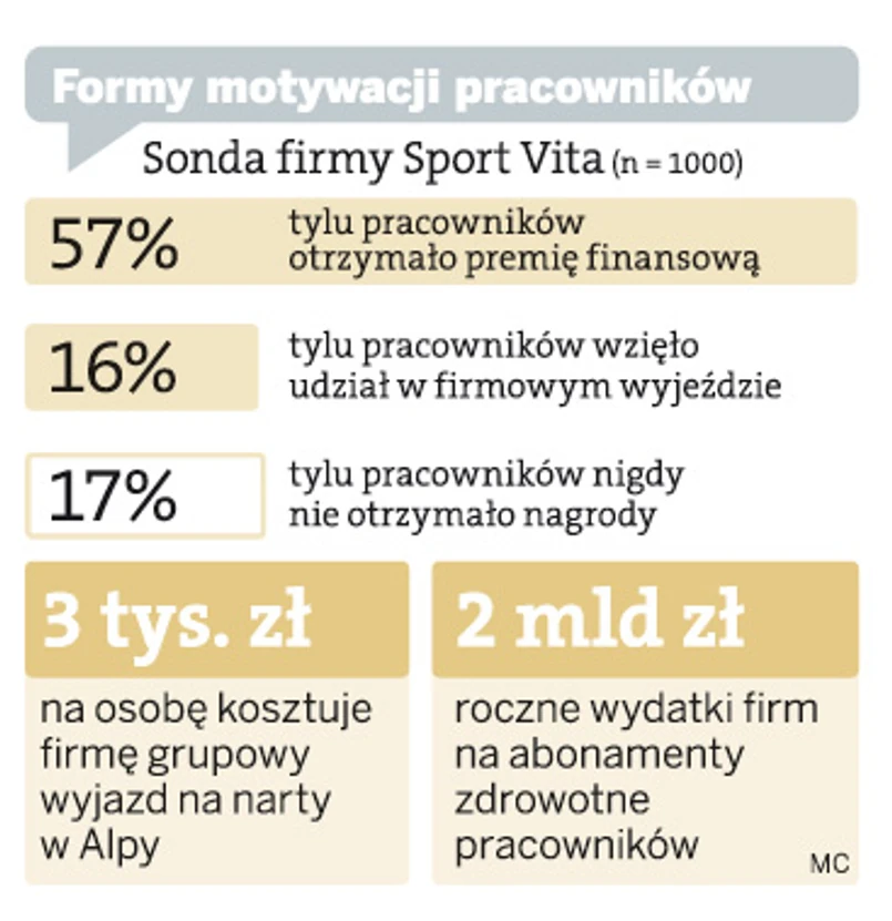Tak wynika z sondy przeprowadzonej przez firmę Sport Vita na reprezentatywnej grupie 1 tys. pracowników. Nadal najpopularniejszą metodą motywowania są premie pieniężne. Jednocześnie znaczna część firm w ogóle nie wprowadza systemu zachęt do pracy. 17 proc. pracowników nigdy nie zostało nagrodzonych za bardzo dobre wykonywanie swoich obowiązków.