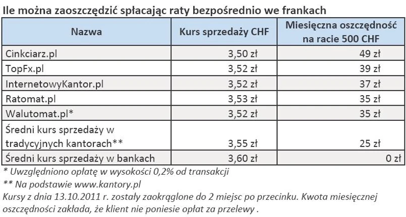 W czasie gdy dokonywaliśmy porównania najniższy kurs franka oferował Cinkciarz.pl – było to niecałe 3,5 zł. W tym samym czasie przeciętny kurs w tradycyjnych kantorach wynosił 3,55 zł, a w bankach 3,6 zł. W rezultacie jeśli rata kredytu wynosi 500 CHF to korzystając z kantoru internetowego co miesiąc można zaoszczędzić nawet 49 zł. Te obliczenia zostały dokonane w oparciu o przeciętny kurs sprzedaży w bankach. W części banków, gdzie kurs jest wyższy od średniej korzyść będzie więc jeszcze większa.