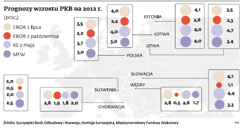 Drugim zaś jest to, że w większości z tych państw sektor bankowy jest zdominowany przez filie banków zachodnioeuropejskich, więc problemy macierzystych instytucji ostatnich automatycznie oznaczają mniej kredytów i mniejszy wzrost gospodarczy. To wszystko dotyczy też naszego kraju. – Polska jest uzależniona od koniunktury w Niemczech i innych najważniejszych krajach Europy Zachodniej. Drugim powodem jest szybki spadek aktywności gospodarczej w Europie Zachodniej, w tym ograniczenie kredytów przez banki – mówi „DGP” Erik Bergloef, główny ekonomista EBOiR. Bank ostrzegł też, że wzrost może się okazać jeszcz mniejszy. Stanie się tak, jeżeli przywódcy strefy euro nie zdołają wypracować rozwiązania kryzysu, zanim przeniesie się on do Włoch i Hiszpanii.