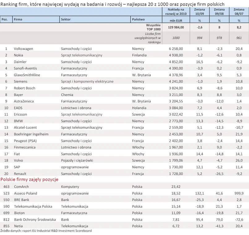 Warto zauważyć, że według danych KE, Asseco Poland zwiększyło w 2010 r. swoje wydatki na R&D o 132,1%, BOŚ o 95,4% a Netia o 13,2%. Porównywalnych danych z 2009 r. dla Comarchu nie podano. BRE, TPSA oraz Bioton zmniejszyły wydatki na R&D. Unijne zestawienie danych dotyczących nakładów na badania i rozwój publikowane jest co roku przez Komisję Europejską (Dyrekcję Generalną ds. Badań Naukowych i Wspólne Centrum Badawcze). Zawiera ono informacje na temat 1400 czołowych przedsiębiorstw na świecie (400 z UE i 1000 spoza UE) ocenianych na podstawie poziomu ich nakładów na badania i rozwój. W zestawieniu tym uwzględnia się całkowity poziom nakładów na badania i rozwój, niezależnie od miejsca, w którym prowadzone są działania badawczo-rozwojowe.