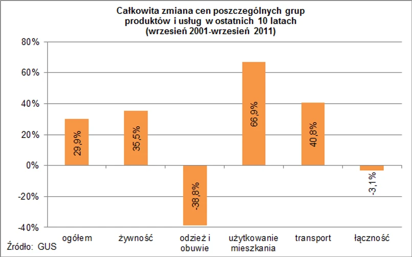 Jednak nie wszystkie ceny rosły w ostatnich 10 latach. Pod prąd ogólnych trendów rynkowych podążają ceny odzieży i obuwia. Od września 2001 ceny tej grupy produktów spadły o blisko 40%. Z kolei ceny usług łączności, na którą składają się ceny usług pocztowych, telekomunikacyjnych oraz koszt minuty połączenia telekomunikacyjnego, przez dziesięć lat w zasadzie nie uległy zmianie (spadek o 3,1%).