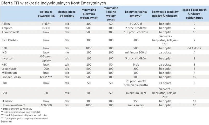 Najwyższej minimalnej pierwszej wpłaty wymagają BPH TFI i Union Investment TFI (1000 zł). Obok PZU TFI po 100 zł chcą za pierwszym razem otrzymać Millennium TFI, KBC TFI, Investors TFI i ING TFI. 300 zł żądają Allianz TFI, BNP Paribas TFI i Skarbiec TFI. 500 zł oczekują Pioneer Pekao TFI, Arka BZ WBK TFI, Amplico TFI i Legg Mason TFI.