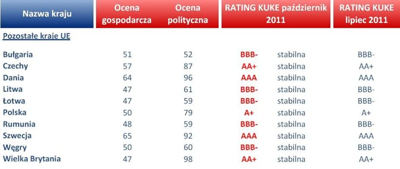Większość ocen pozostaje taka sama jak agencji światowych. KUKE jest jednak daleka od siania paniki i nie pokusiła się o obniżenie poziomu wiarygodności Francji, czy Hiszpanii, tak jak Standard & Poor’s czy Moody’s wcześniej w październiku.