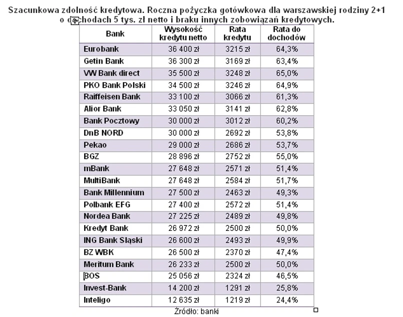 Zdolność kredytowa badanej przez Open Finance rodziny spadła o 3,6 proc. w ciągu czterech miesięcy. Wciąż nie brakuje jednak banków, które deklarują pożyczenie ponad 30 tys. do spłaty w rok. Rata kredytu przekracza wtedy 60 proc. dochodów (3 tys. zł). To wiele, lecz wciąż w zgodzie z zapisami tzw. rekomendacji T wydanej przez Komisję Nadzoru Finansowego. Dokument ten stanowi, iż miesięczne wydatki na obsługę zobowiązań kredytowych nie mogą być wyższe niż 65 proc. dochodów netto. Dla osób o dochodach nie przekraczających przeciętnego wynagrodzenia w gospodarce próg ustanowiono jeszcze niżej, na poziomie 50 proc.