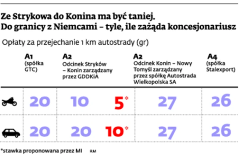 Projekt zakłada obniżenie o 50 proc. stawek dla samochodów osobowych (z 20 do 10 groszy za kilometr) oraz motocykli (z 10 do 5 gr). Powód pomysłu, jaki zrodził się w Ministerstwie Infrastruktury, jest dość irracjonalny – zdaniem resortu zachowanie obecnych stawek grozi tym, że wpływy z ich tytułu, a także z wprowadzonego w lipcu e-myta, będą znacznie wyższe, niż pierwotnie oczekiwano. To będzie oznaczało, że Polska będzie musiała zwrócić część unijnych dotacji, dzięki którym finansowana jest budowa państwowych autostrad. Bruksela nie finansuje bowiem projektów publicznych, które mają charakter komercyjny. Wpływy z opłat powinny zatem – w myśl unijnych przepisów – pokrywać jedynie koszty ich utrzymania.