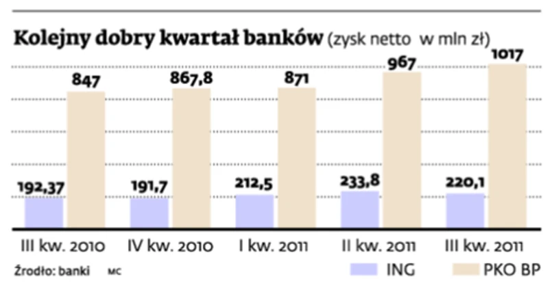 Niezłymi wynikami pochwalił się też ING. Bank zarobił w III kw. 220,1 mln zł, czyli o 14 proc. więcej niż w III kw. 2010 r. Analitycy zwracają jednak uwagę, że wynik byłby znacznie słabszy, gdyby zarząd nie rozwiązał części rezerw na kredyty udzielone firmom.