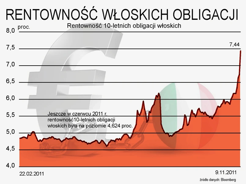 Analityk DM BOŚ Marek Rogalski powiedział, że tak wysoki poziom rentowności włoskich obligacji może oznaczać kłopoty ze sfinansowaniem się tego kraju. "Jeśli w najbliższym czasie, czyli do najbliższego rolowania obligacji, poziom ten nie spadnie, to Włochy będą miały problem ze znacznie większymi kosztami długu. W pewnym momencie może się okazać, że kraj nie ma środków na obsługę zadłużenia" - powiedział.