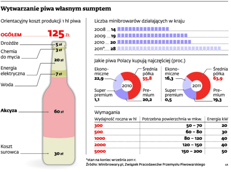 – Produkcja 1 litra piwa kosztuje około 3 zł. Sprzedaje się je natomiast średnio po 10 – 12 zł za pół litra. To oznacza, że marża na własnoręcznie wyprodukowanym piwie jest przynajmniej dwa razy wyższa niż w przypadku tego dostarczanego do restauracji przez zewnętrzne browary. Te bowiem żądają za litr 5,5 zł – tłumaczy Andrzej Gałasiewicz, właściciel firmy Minibrowary.pl, specjalizującej się w doradztwie i produkcji urządzeń do warzenia piwa.