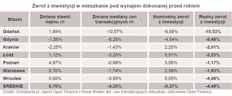 Według ostatnich danych GUS roczny wskaźnik inflacji wyniósł 4,3 proc. W tym czasie liczony przez nas indeks cen transakcyjnych mieszkań stracił na wartości o 3,7 proc. W ujęciu realnym daje to więc spadek o blisko 7,7 proc. Jednocześnie stawki ofertowe najmu średnio wzrosły w ciągu roku o 0,7 proc. Nie powinno być więc zaskoczeniem, że inwestycja w mieszkanie pod wynajem dokonana przed rokiem przyniosła raczej mizerne zyski. Nominalny zwrot z takiej inwestycji w skali roku podliczyliśmy średnio na -0,37 proc., ale już po uwzględnieniu inflacji strata urasta do niemal 4,5 proc. Najbardziej stratni są ci, którzy zainwestowali w Gdańsku (minus 10,5 proc.) i Gdyni (minus 8,5 proc.). Mniej ucierpieli inwestorzy w Poznaniu (minus 1,2 proc.), Warszawie (minus 1,8 proc.) oraz Krakowie (minus 2 proc.).
