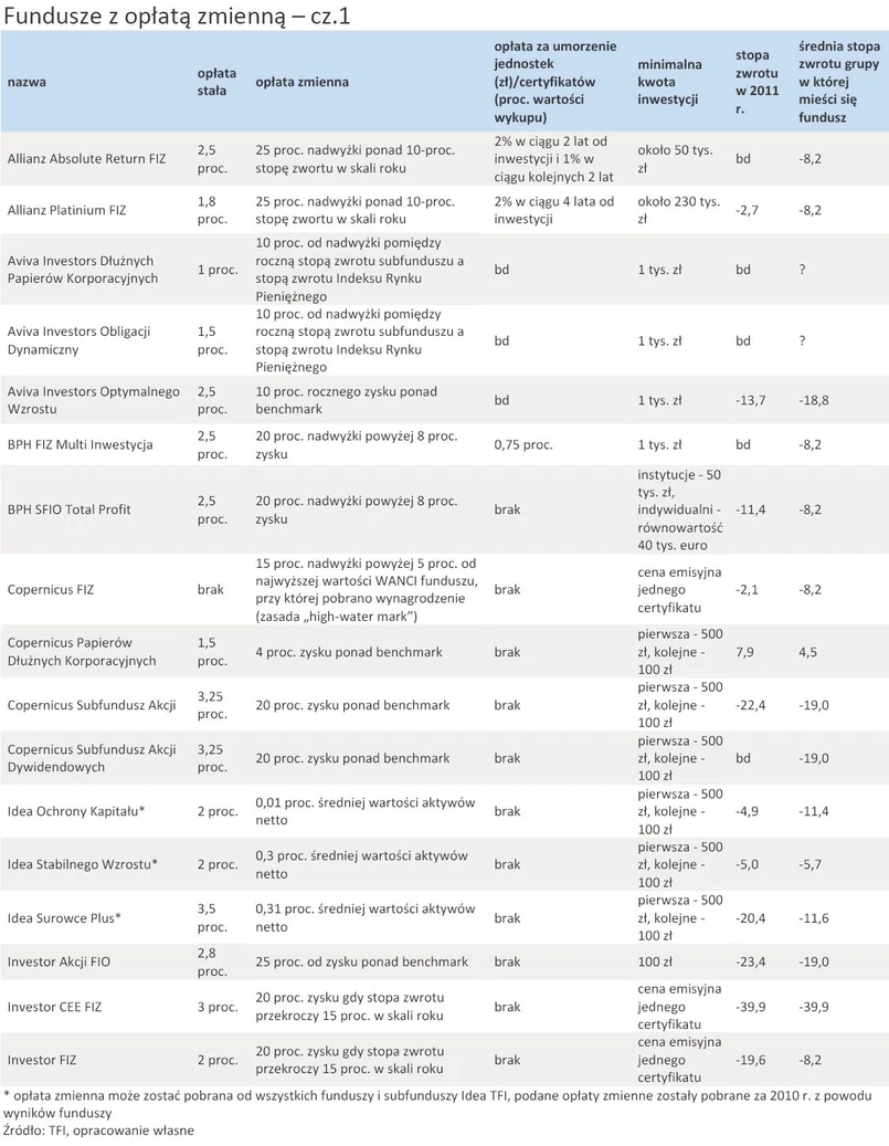 Fundusz z opłatą zmienną zamierza uruchomić także TFI PKO, które do tej pory nie miało w ofercie tego rodzaju produktu. W grudniu rozpocznie działalność PKO Globalnej Makroekonomii FIZ niepubliczny. Jest adresowany do zamożnych inwestorów. PKO TFI będzie pobierało stałą opłatę w wysokości 3,5 proc. i zmienną w wysokości 10 proc. zysku w skali roku. Niektóre TFI planują kolejne subskrypcje istniejących już funduszy zamkniętych z opłatą zmienną. Zapowiadają je Quercus TFI (Absolute Return FIZ ma zbierać pieniądze już w styczniu 2012 r.) oraz Allianz TFI (również Absolute Return FIZ).