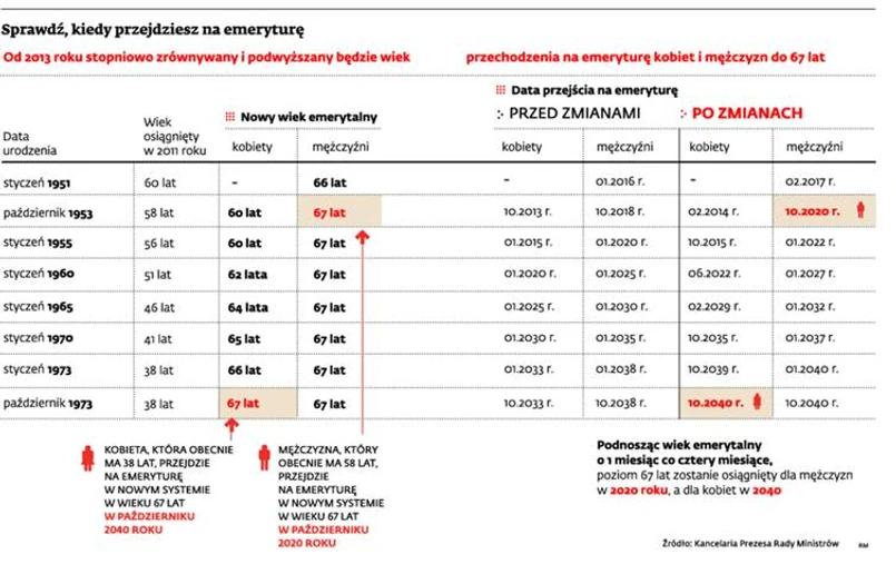 Od 2040 r. kobiety, a od 2020 r. mężczyźni będą przechodzić na emeryturę w 67. roku życia. Rząd chce, aby proces wydłużania rozpoczął się już od 2013 r. Co 4 miesiące wiek emerytalny będzie stopniowo wydłużony o jeden miesiąc, co oznacza, że 50-letnia kobieta będzie pracowała o 3 lata dłużej, natomiast jej 30-letnia koleżanka o 7 lat dłużej.