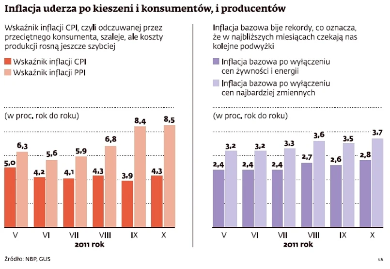 – Wysoki poziom inflacji bazowej jest efektem osłabienia złotego i wzrostu cen paliw, co przeniosło się na koszty usług i towarów – mówi Wiktor Wojciechowski, główny ekonomista Invest- Banku. – Jeśli wzrośnie do 3 proc., a to możliwe, bo planowana są podwyżka akcyzy na paliwa i podwyżka energii, to RPP może podjąć decyzję o podniesieniu stóp procentowych, nawet kosztem spowolnienia gospodarczego – dodaje prof. Andrzej Kaźmierczak, członek RPP. Walkę z inflacją utrudnia słaby złoty, ale szans na umocnienie polskiej waluty na razie brak. – W konsekwencji wszystko drożeje – konstatuje Aleksandra Bluj, ekonomistka Pekao SA. I wylicza – za paliwami i energią w górę idą ceny wszystkich towarów, także żywności, odzieży oraz usług.