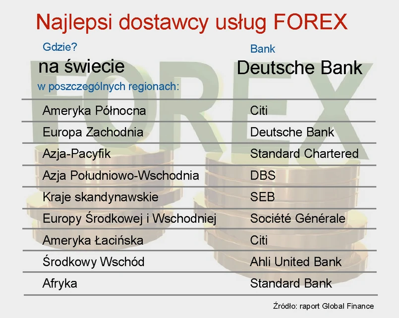 W Polsce najlepszym dostawcą usług Forex w rankingu Global Finance został bank Pekao. W Niemczech – Deutsche Bank, we Francji – BNP Paribas, w Wielkiej Brytanii - Barclays Capital, zaś w USA – Citi.