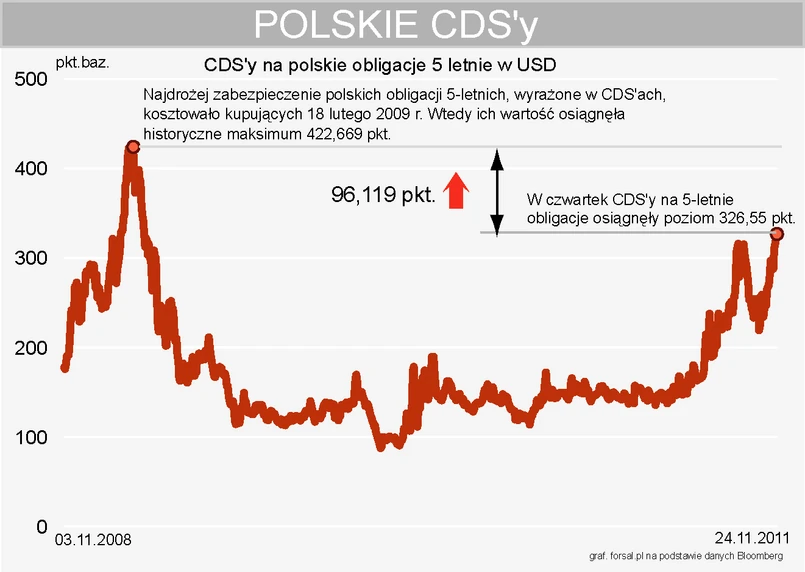 Jak wynika z danych zebranych przez Bloomberga, najwyżej w historii polskie CDS-y wyceniane były 18. lutego 2009. Wówczas koszt zabezpieczenia przed niewypłacalnością Polski sięgnął 422,669 pkt bazowych. Aby dotrzeć do tego szczytu, obecna wycena CDS-ów musiałaby jeszcze wzrosnąć o 96,1 pkt bazowego.