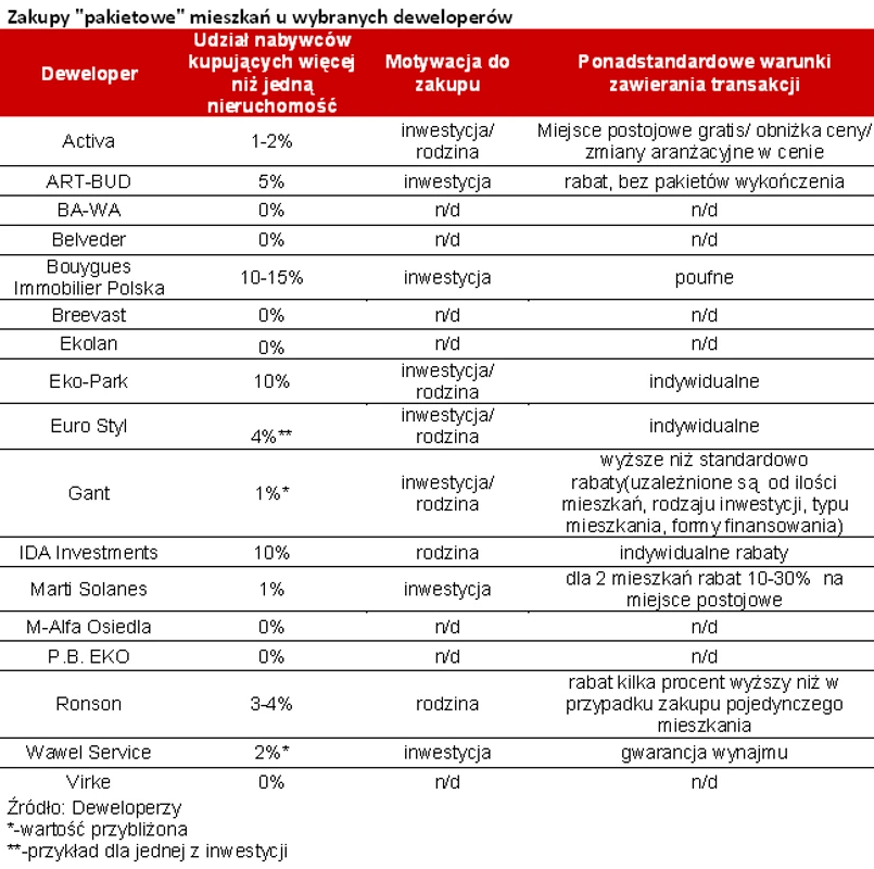 Firmy Bouygues Immobilier i Eko-Park podają z kolei, że obok klientów kupujących „rodzinne” pakiety mieszkań mają też do czynienia z nabywcami, którzy realizują cel czysto inwestycyjny, tzn. traktują nieruchomość jako formę lokaty kapitału. U tych deweloperów, nabywcy więcej niż jednego mieszkania stanowią 10% wszystkich klientów. - Nabywcy, którzy realizują cel inwestycyjny kupują nawet do trzech mieszkań w jednej inwestycji. Łączna wartość takiej transakcji wynosi co najmniej kilka milionów złotych – informuje Barbara Klassek, dyrektor ds. marketingu i sprzedaży w Eko-Park.