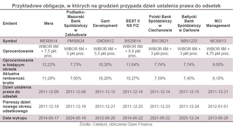 W grudniu przypada dzień ustalenia prawa do odsetek dla 44 serii notowanych na rynku Catalyst obligacji. Trzy czwarte z nich ma oprocentowanie zmienne, ustalane na podstawie stawki bazowej powiększonej o marżę. Za sprawą rosnącego WIBOR-u lada moment ich oprocentowanie wzrośnie o 0,2-0,3 pkt proc. Natomiast właściciele bankowych lokat mogą co najwyżej obejść się smakiem. Na oprocentowanie ich depozytów w pierwszej kolejności wpływa próba wyeliminowania kapitalizacji dziennej z oferty instytucji finansowych, a nie sytuacja na rynku międzybankowym. Co prawda stawki na lokatach rosną, ale tylko zawieranych na krótkie terminy. Klientom zainteresowanym długoterminowym oszczędzaniem banki nie mają wiele do zaoferowania. Dlatego to może być dobry moment, aby zainteresować się kupnem papierów dłużnych.