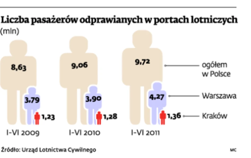 Na razie przepaść pomiędzy oboma lotniskami jest duża. W 2010 r. w Warszawie obsłużono 8,6 mln pasażerów – trzy razy więcej niż w Krakowie.