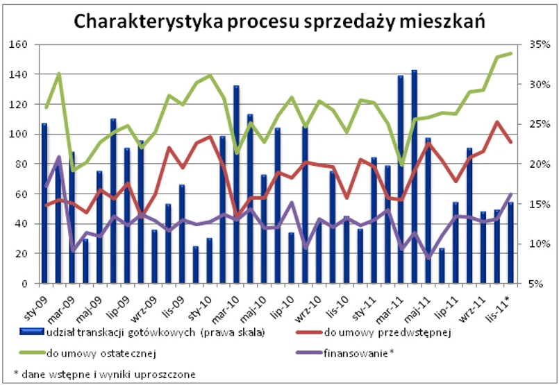 W związku z tym, że w listopadzie oczekiwanie na umowę końcową trwało dłużej, a na przedwstępną krócej niż przed miesiącem wydłużył się przeciętny czas upływający pomiędzy nimi. W dużym uproszczeniu okres ten można utożsamić z czasem, który potrzebują kupujący na zdobycie finansowania transakcji. Obecnie wynosi on 59 dni. Dla porównania w ostatnich 12 miesiącach było to 38 dni. Gdyby w kolejnych miesiącach okres ten powrócił do normy powodów okresowego wydłużenia można by było upatrywać w zawirowaniach na rynku walutowym.