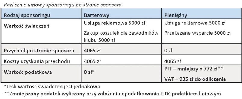 Sponsoring w formie porozumienia barterowego (sponsorowany świadczy usługę reklamy a sponsorujący w zamian przekazuje towary lub świadczy usługi) nie jest jednak dobrym rozwiązaniem dla tych, przedsiębiorców, którym zależy na obniżeniu podstawy opodatkowania. Jeśli zależy nam by przy okazji sponsoringu zyskać podatkowo należy sponsorowanego wesprzeć finansowo. W takiej sytuacji przekazane pieniądze będą stanowiły koszt związany z „zakupem” reklamy. Nie powstanie natomiast przychód. Dla sponsora czynność ta nie jest opodatkowana VAT, gdyż nie świadczy on żadnej usługi ani też nie dokonuje sprzedaży.