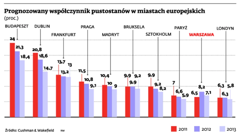 Oczywiście sytuacja na poszczególnych rynkach europejskich będzie zróżnicowana. Wskaźniki pustostanów nieznacznie się zmniejszą, ale w niektórych miastach wzrosną ze względu na spadek popytu i wzrost inwestycji. W 2012 r. nowe biurowce zostaną oddane do użytku m.in. w Mediolanie, Warszawie, Madrycie i Sztokholmie, ale w skali ogólnoeuropejskiej aktywność deweloperska zmniejsza się.