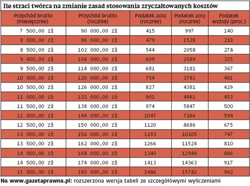 Jeśli przemier zrealizuje swoje zapowiedzi z expose, od stycznia 2013 roku osoby, które na pracy twórczej zarobią więcej niż 85 528 zł rocznie, stracą prawo do zryczałtowanych 50-proc. kosztów. Dla twórców, którzy nie przekroczą tego progu, nic się nie zmieni.