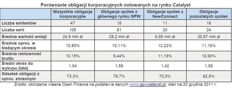 Klasyfikując osobno spółki notowane na rynku głównym GPW i NewConnect widać wyraźną różnicę w emitowanych przez nie papierach dłużnych. Zarówno pod względem wysokości zysków, jak i wartości emisji. Przy przeciętnym aktualnym oprocentowaniu wszystkich obligacji korporacyjnych na poziomie 10,85 proc., papiery dłużne spółek z głównego parkietu dają zarobić średnio o 0,74 pkt proc. mniej. Natomiast najwyższe odsetki oferują nie spółki spoza giełdy (11,16 proc.), lecz podmioty z rynku NewConnect, które płacą średnio 12,22 proc. Wyrażając w uproszczeniu popyt na obligacje, jako różnicę pomiędzy ich bieżącym oprocentowaniem, a rentownością brutto, z łatwością można stwierdzić, że to właśnie papiery dłużne przedsiębiorstw z „małego parkietu” cieszą się największym powodzeniem. Przy czym częściowo na ten obraz wpływa również najkrótszy czas do wykupu, który w przypadku spółek z NewConnect przeciętnie wynosi 1,42 roku, wobec 1,54 roku dla całego rynku.
