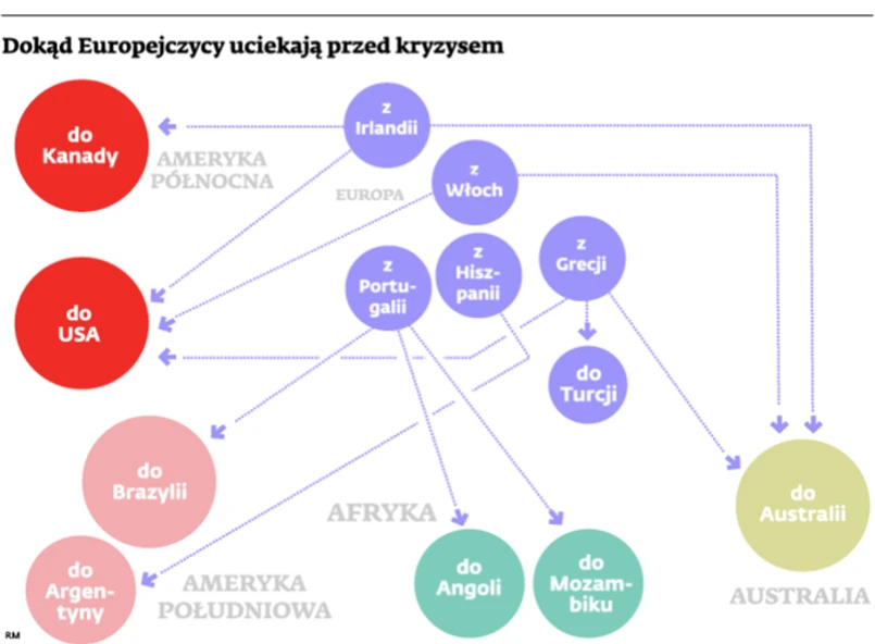 Na dodatek nie chodzi tylko o migracje do bogatszych i niezagrożonych bankructwem państw, jak Niemcy czy Holandia. Mieszkańcy Grecji, Irlandii, Portugalii, Włoch czy Hiszpanii coraz częściej szukają szczęścia na innych kontynentach.
