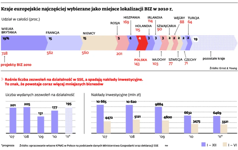 Według danych na koniec października liczba zagranicznych inwestycji w Polsce w porównaniu z tym samym okresem 2010 r. wzrosła o 34 proc. Spośród projektów zrealizowanych w tym roku tylko połowa należy do firm już działających w naszym kraju. Pozostałe 50 proc. stanowią inwestycje nieobecnych dotąd w Polsce przedsiębiorstw. Naszym rynkiem najbardziej interesują się firmy z branży motoryzacyjnej. Wynika to w dużej mierze ze strategii budowania klastrów, których przewagą konkurencyjną jest organizacja i tworzenie łańcucha zaopatrzenia. Polską interesują się wciąż koncerny z branży przemysłu maszynowego, przede wszystkim artykułów gospodarstwa domowego, w której to branży nasz kraj wyrósł w tym roku na europejską potęgę. Będzie się pojawiać coraz więcej firm z sektora IT i telekomunikacyjnego.