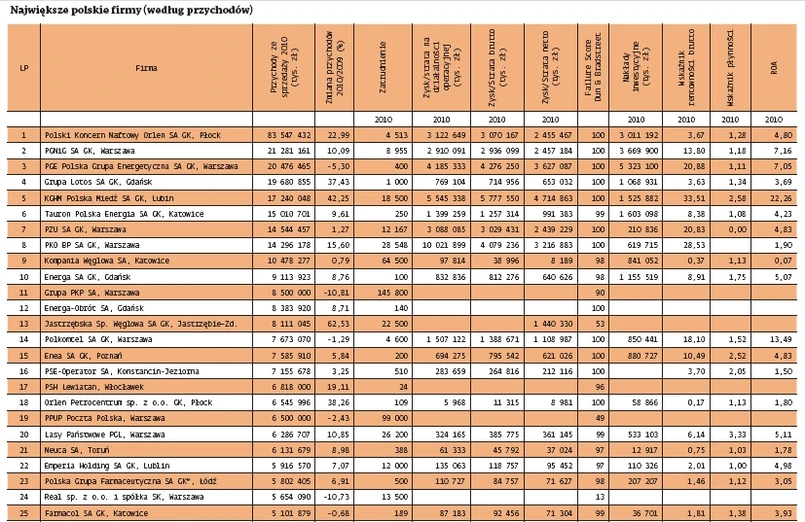 Jedynie Polska Grupa Energetyczna wśród pierwszych dziesięciu spółek nie może pochwalić się wzrostem obrotów wobec poprzedniego roku. Niewielki wzrost przychodów PZU, największego polskiego ubezpieczyciela, nie pozwolił mu na utrzymanie czwartej pozycji z zeszłego roku. W tym czasie wyprzedziły go firmy z większą dynamiką przychodów: Grupa Lotos, KGHM i Tauron. Wszystkie osiem pierwszych spółek są notowane na warszawskiej giełdzie i wchodzą w skład elitarnego indeksu WIG20, którego wartość w całym 2010 roku wzrosła o niemal 15 proc.