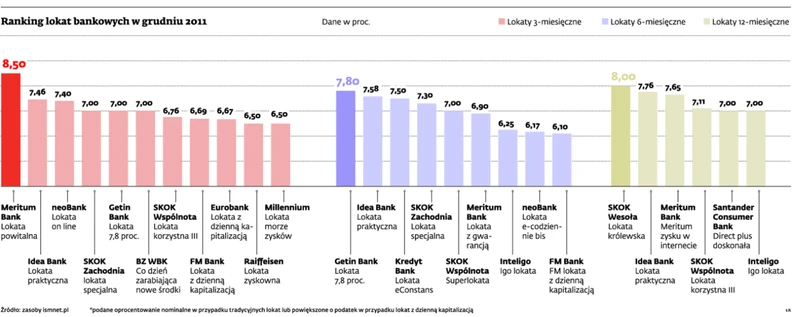 Wśród banków oferujących depozyty 3-miesięczne najwyższe odsetki oferują obecnie Meritum Bank – wynika z rankingu przygotowanego przez ISMnet.pl. Sprzedaje on lokaty z dzienną kapitalizacją z oprocentowaniem odpowiadającym 8,5 proc. na standardowym depozycie. Kolejne instytucje odbierają od lidera, oferując oprocentowanie na poziomie ponad 7 proc. Wymienić tu należy Idea Bank i neoBank, z produktami o kuponach odpowiednio 7,46 proc. i 7,4 proc. Trzy kolejne instytucje dają zarobić równe 7 proc. w skali roku. Są to: SKOK Zachodnia, Getin Bank i BZ WBK. W czołówce rankingu znalazły się jeszcze Millennium z lokatą „Morze zysków” oraz Raiffeisen z „lokatą zyskowną” – obie dają odsetki na poziomie 6,5 proc.