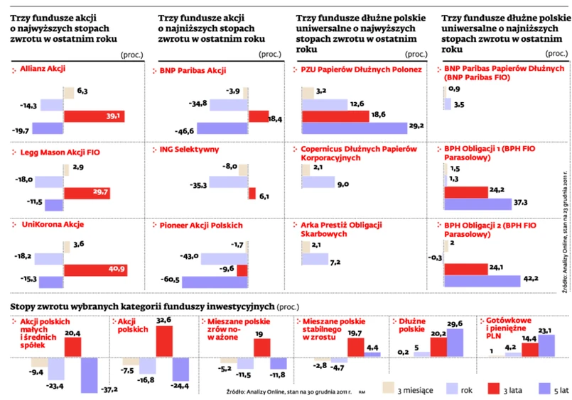 Fundusze uważane za bezpieczne, czyli należące do kategorii funduszy rynku pieniężnego (lokują środki głównie w bonach skarbowych i na depozytach bankowych) i funduszy dłużnych (kupują głównie obligacje) pokażą stopy zwrotu wahające się między 4 a 5 proc. Konsensus prognoz dla tych pierwszych wynosi 4,23 proc., a dla tych drugich 4,97 proc. – Krótkoterminowe stopy procentowe pozostaną zapewne na obecnych poziomach. Poza tym część funduszy ma znaczny udział w wysoko rentownych papierach nieskarbowych. Te elementy – po odjęciu opłat za zarządzanie – powinny przynieść pozytywny wynik dla całej kategorii funduszy bezpiecznych – uważa Łukasz Tokarski z Superfund TFI. Od początku stycznia do końca listopada 2011 r. jednostki funduszy dłużnych zyskały 4,1 proc., a rynku pieniężnego 3,9 proc.