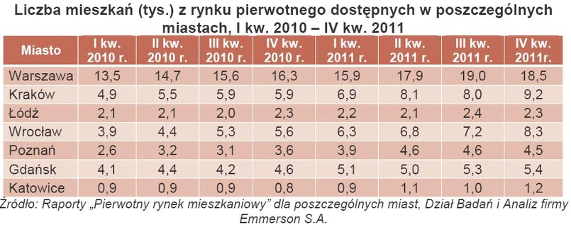 Poniżej przedstawione zostało zestawienie liczby mieszkań deweloperskich dostępnych w wybranych miastach w okresie od I kwartału 2010 r. do IV kwartału 2011 r.
