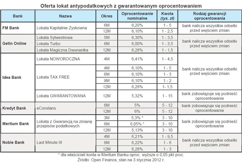 Sześć banków na rynku umożliwiło klientom wydłużenie okresu bezpodatkowego oszczędzania. Polega to na naliczeniu całości należnych odsetek jeszcze według obecnych zasad lub gwarancji podwyższenia oprocentowania w dniu wejścia zmian w ordynacji podatkowej. W efekcie, klienci mogą przebierać w ofertach na 5 proc. netto i więcej, a banki nie muszą obawiać się odpływu depozytów w najbliższej przyszłości.