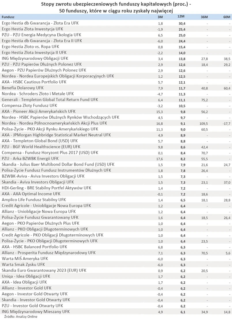 W czołówce znalazły się jeszcze cztery inne UFK Ergo Hestii, wszystkie oparte na cenach surowców. W pierwszej dziesiątce jest także PZU Energia Medycyna Ekologia (25 proc. zarobku) – fundusz inwestujący w akcje spółek z tytułowych branż – oraz produkty oparte na papierach dłużnych oferowane przez grupy ING, PZU, Nordea i Aegon.