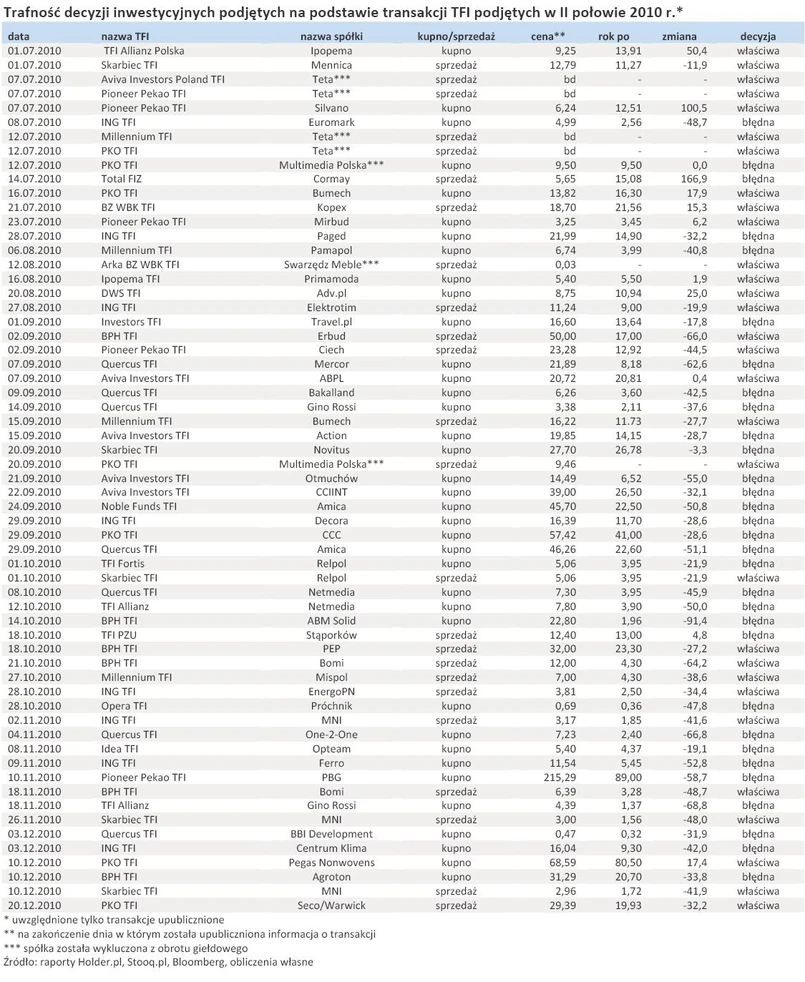 Trafne i błędne decyzje towarzystw funduszy inwestycyjnych (TFI) dotyczące zwiększania albo zmniejszania zaangażowania w spółkach giełdowych równoważą się – wynika z analizy „DGP”. 31 decyzji podjętych przez fundusze w II połowie 2010 roku po 12 miesiącach okazało się decyzjami niewłaściwymi. Ale z drugiej strony 30 było trafionych. Chodzi oczywiście o decyzje, które zostały upublicznione w giełdowych serwisach informacyjnych, czyli dotyczące papierów stanowiących powyżej 5 proc. ogółu walorów.