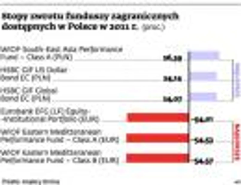 W odwrocie były natomiast agresywne strategie oparte na akcjach – twierdzi Waszczyk. W 2011 roku najlepszym zagranicznym funduszem na polskim rynku był podmiot World Investment Opportunities Funds inwestujący w firmy z Azji Południowo- -Wschodniej, dał 26,4 proc. zysku.