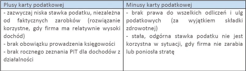 Tyle plusów, czas na przedstawienie drugiej strony medalu. Niewątpliwy atut karty podatkowej, jakim jest odgórny podatek niezależny od dochodu, może obrócić się przeciwko przedsiębiorcom w trudnych czasach dla firmy. Jeśli bowiem przedsiębiorca nie zarabia lub firma wręcz przynosi stratę, podatek i tak trzeba fiskusowi zapłacić. „Kartowicze” nie mają też prawa do żadnych odliczeń i ulg podatkowych. Nie mogą nawet uwzględnić zapłaconych składek na ubezpieczenia społeczne – jedyne, co wolno im odliczyć od podatku, to wspomniane wcześniej składki na ubezpieczenie zdrowotne.