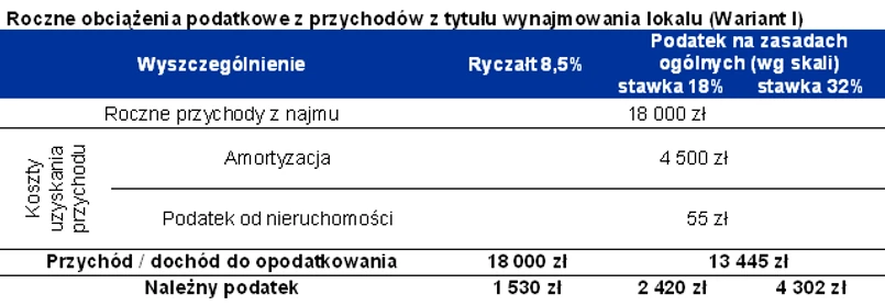 Jeśli lokal wart 300 tys. zł można wynająć otrzymując 18 tys. zł rocznie, to ryczałt od przychodu pochłonąłby 1530 zł. Wysokość podatku w przypadku opodatkowania na zasadach ogólnych, zależy od poziomu kosztów uzyskania przychodu. Gdyby były one relatywnie niskie, to podatek płacony od dochodu nie byłby optymalnym rozwiązaniem. I tak na przykład zaliczając w koszty podatek od nieruchomości (dla lokalu o powierzchni 50 m kw. z niewielkim udziałem w gruncie pod budynkiem można je oszacować na 55 zł w skali roku) i amortyzację w wysokości 4500 zł rocznie, podatek naliczany od dochodu z najmu wyniósłby 2420 zł lub 4302 zł. Niższy z nich będzie trzeba zapłacić, gdy dochód opodatkowany jest stawką 18% (roczny dochód nie przekracza 85 528 zł), wyższy gdy zastosowanie ma stawka 32%. W rozważanym przypadku właściciel mieszkania jest też współwłaścicielem gruntu pod budynkiem. Nie musi więc wnosić opłat za użytkowanie wieczyste.