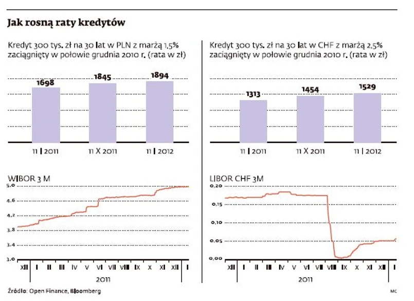 – Banki, nie wiedząc, co się stanie, boją się pożyczać sobie pieniądze. A te, które na to się decydują, naliczają premię za ryzyko – mówi Halina Kochalska, analityk Open Finance. – W efekcie rośnie WIBOR. A to przekłada się na wysokość rat kredytów mieszkaniowych. Dostajemy po kieszeni Z wyliczeń Home Broker i Open Finance wynika, że klienci, którzy rok temu zaciągnęli 300 tys. zł kredytu hipotecznego na 30 lat, zapłacą teraz o 196 zł więcej niż przy podpisywaniu umowy kredytowej, z czego ok. 50 zł to wynik skoku WIBOR w IV kwartale 2011 r. W sumie rata takiego kredytu wynosi 1894 zł. Wzrost raty w złotych jest niewiele mniejszy niż kredytów denominowanych we frankach szwajcarskich na tę samą kwotę.